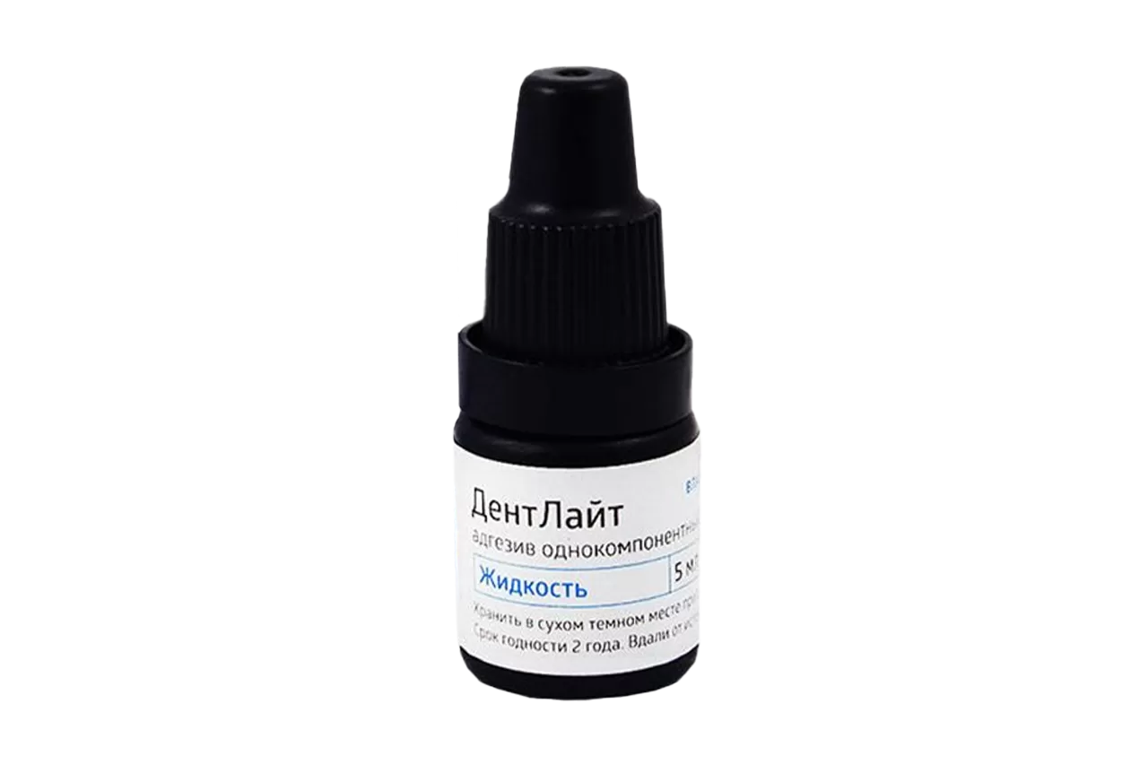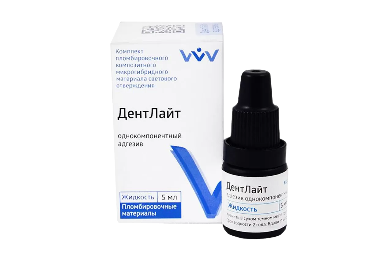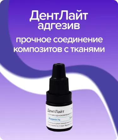 ДентЛайт адгезив от производителя ВладМиВа - это однокомпонентная адгезивная система светового отверждения V поколения с защитой от микроподтеканий. Этот продукт обеспечивает прочное соединение светоотверждаемых композитных материалов с твердыми тканями зуба, что делает его надежным выбором для реставраций. Применение адгезива пятого поколения упрощает процесс адгезивной подготовки и снижает влияние человеческого фактора, благодаря комбинированию процессов прайминга и бондинга в один этап. Все это делает систему тотального травления, включающую в себя адгезив ВладМиВа, надежной, долговечной и высокоэффективной.