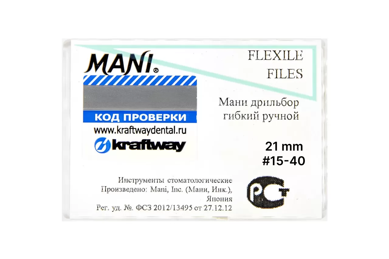 Flexile Files N15-40 L21 ручной от Mani - это ручной режущий эндодонтический инструмент с рабочей частью, выполненной в виде спиральной нарезки. Он изготовлен из нержавеющей стали и пластика и чаще всего применяется в качестве вспомогательного средства для прохождения и расширения сильно искривленных каналов.