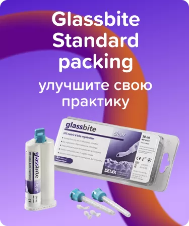 Glassbite Standard packing для регистрации прикуса от Detax - это прозрачный материал для регистрации прикуса на основе A-силикона. Объем упаковки составляет 50 мл, материал имеет среднетекучую консистенцию и тиксотропные свойства. Он предназначен для прямого нанесения на зубные ряды. Полимеризация происходит быстро, в течение 60 секунд в полости рта. У материала высокая окончательная твердость по шкале Шора, примерно 80 A. Glassbite также может использоваться как шаблон для светоотверждения композитов или при установке вспомогательных элементов. Он рентгенопрозрачный и легко обрабатывается (резка, фрезерование).