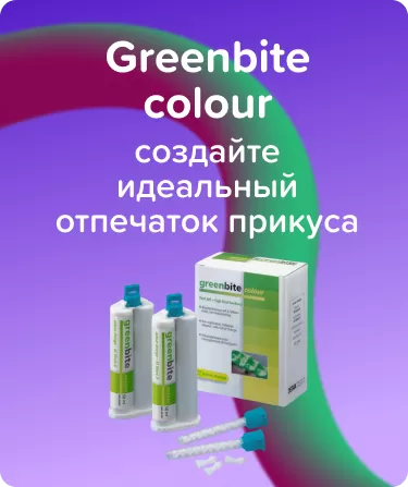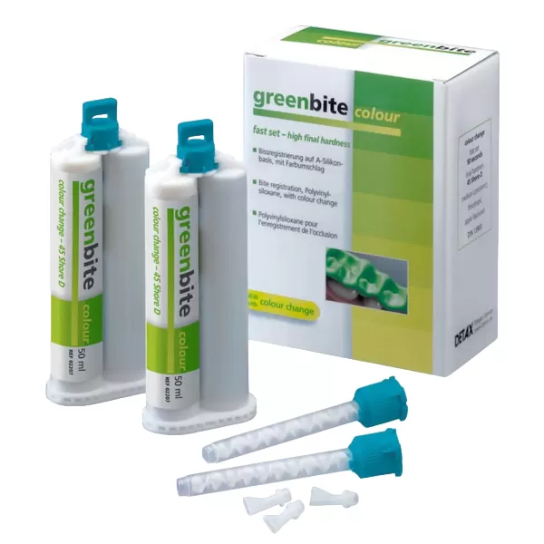 Greenbite colour на основе A-силикона для регистрации прикуса обеспечивает максимальный комфорт в работе благодаря изменению цвета во время полимеризации. Этот продукт производится компанией Detax, которая уже более 50 лет занимается разработкой силиконов для стоматологии. Гринбайт Колор обладает средней вязкостью и текучестью, что делает его идеальным для нанесения на зубной ряд. Аромат зеленого яблока и яркий цвет материала создают комфортные условия при работе с любыми пациентами, а изменение цвета в процессе полимеризации обеспечивает удобный визуальный контроль.