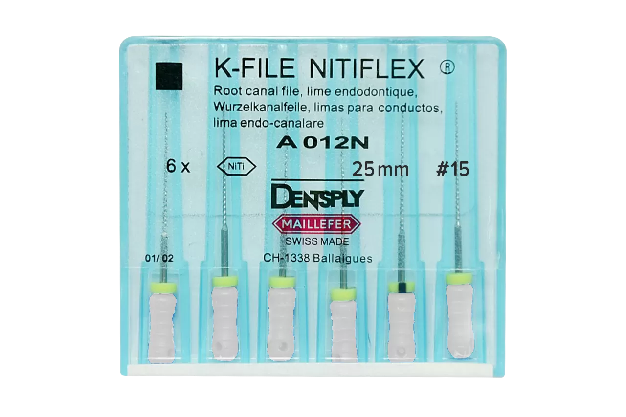 K-File Nitiflex N15 L25 ручные от производителя Dentsply Sirona - это высококачественный инструмент, предназначенный для срезания дентина при ретракции и выравнивания стенок корневого канала во время его расширения. Изготовленный из никель-титанового сплава, он обеспечивает дополнительную прочность и эластичность, что делает его идеальным выбором для стоматологических процедур.