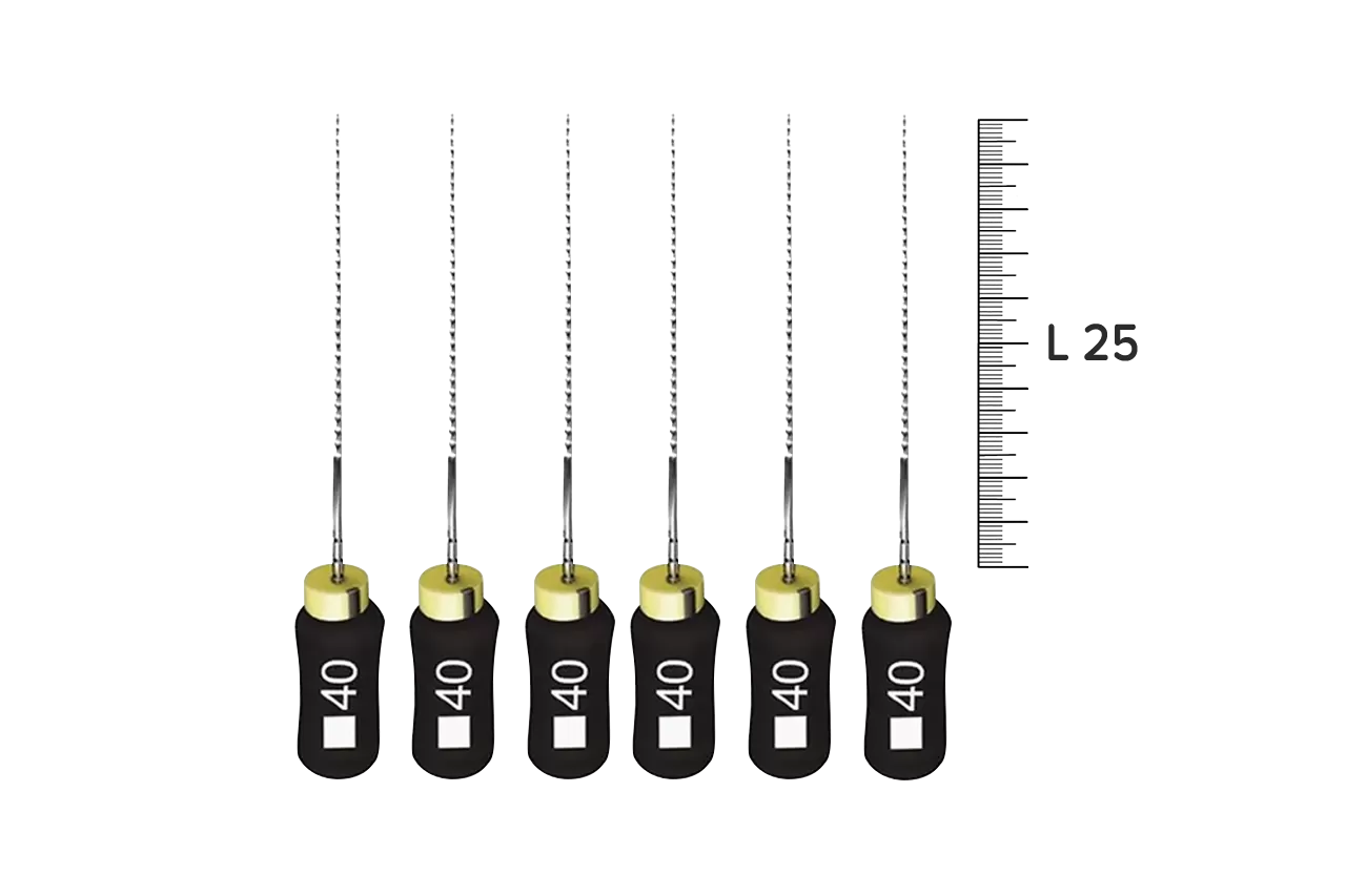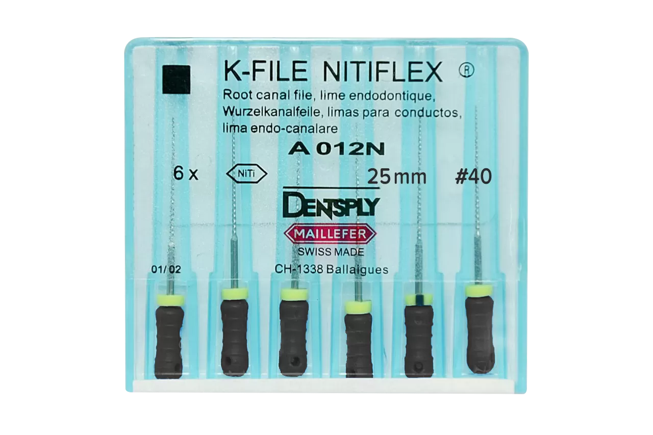 K-File Nitiflex N40 L25 ручные от производителя Dentsply Sirona - это высококачественный инструмент, предназначенный для срезания дентина при ретракции и выравнивания стенок корневого канала во время его расширения. Изготовленный из никель-титанового сплава, он обеспечивает дополнительную прочность и эластичность, что делает его идеальным выбором для стоматологических процедур.