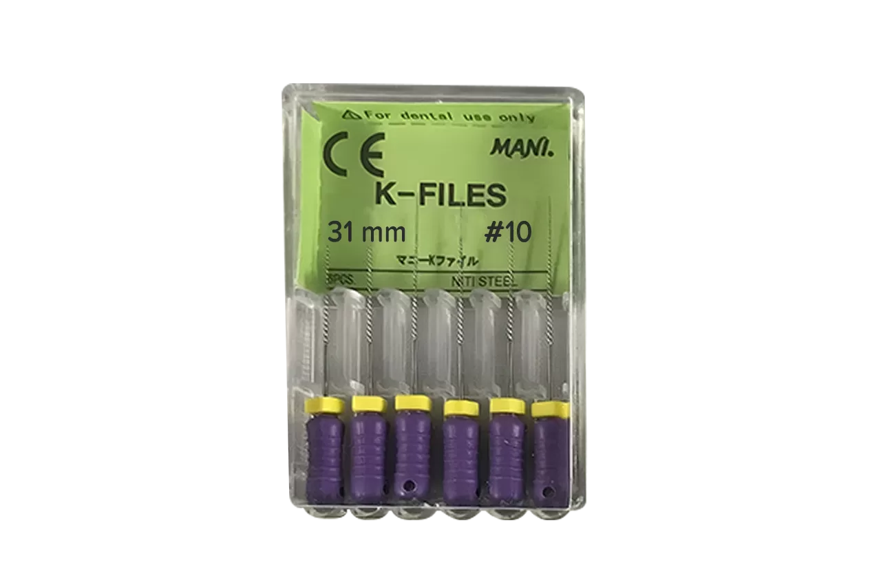 K-Files Mani N10 L31 ручные от Mani используются в стоматологии для подготовки корневых каналов перед проведением сложных реставрационных процедур, включая работу с сильно искривленными каналами. Эти ручные эндодонтические инструменты с режущей функцией имеют спиралевидную нарезку на рабочей части и изготовлены из нержавеющей стали. Рукоятки сделаны из пластика (полибутилентерефталата).