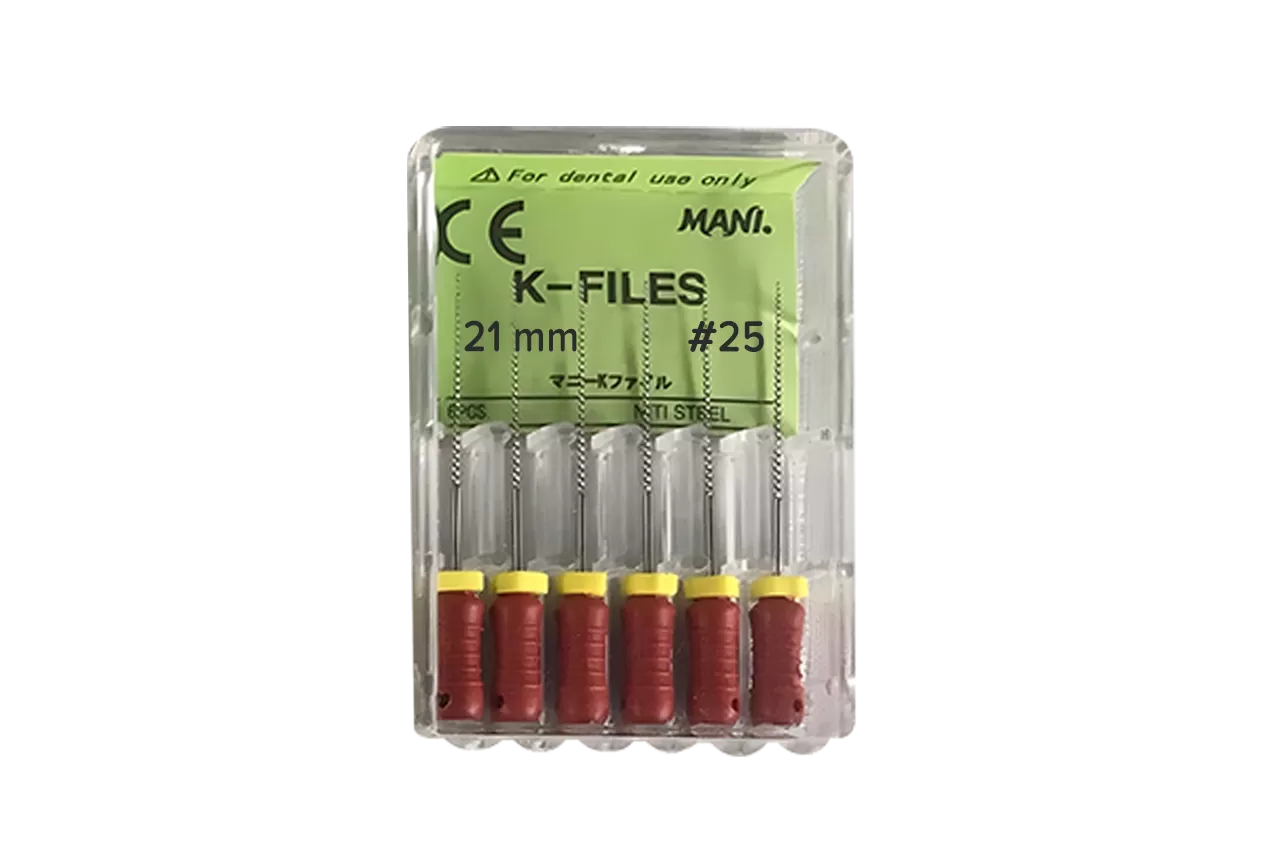 K-Files Mani N25 L21 ручные от Mani используются в стоматологии для подготовки корневых каналов перед проведением сложных реставрационных процедур, включая работу с сильно искривленными каналами. Эти ручные эндодонтические инструменты с режущей функцией имеют спиралевидную нарезку на рабочей части и изготовлены из нержавеющей стали. Рукоятки сделаны из пластика (полибутилентерефталата).