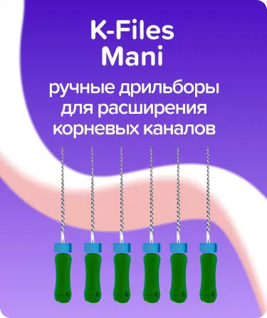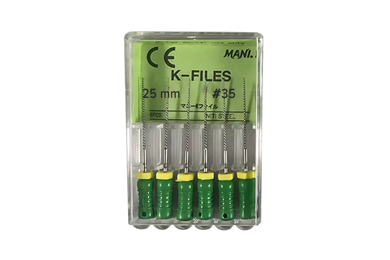K-Files Mani N35 L25 ручные от Mani используются в стоматологии для подготовки корневых каналов перед проведением сложных реставрационных процедур, включая работу с сильно искривленными каналами. Эти ручные эндодонтические инструменты с режущей функцией имеют спиралевидную нарезку на рабочей части и изготовлены из нержавеющей стали. Рукоятки сделаны из пластика (полибутилентерефталата).