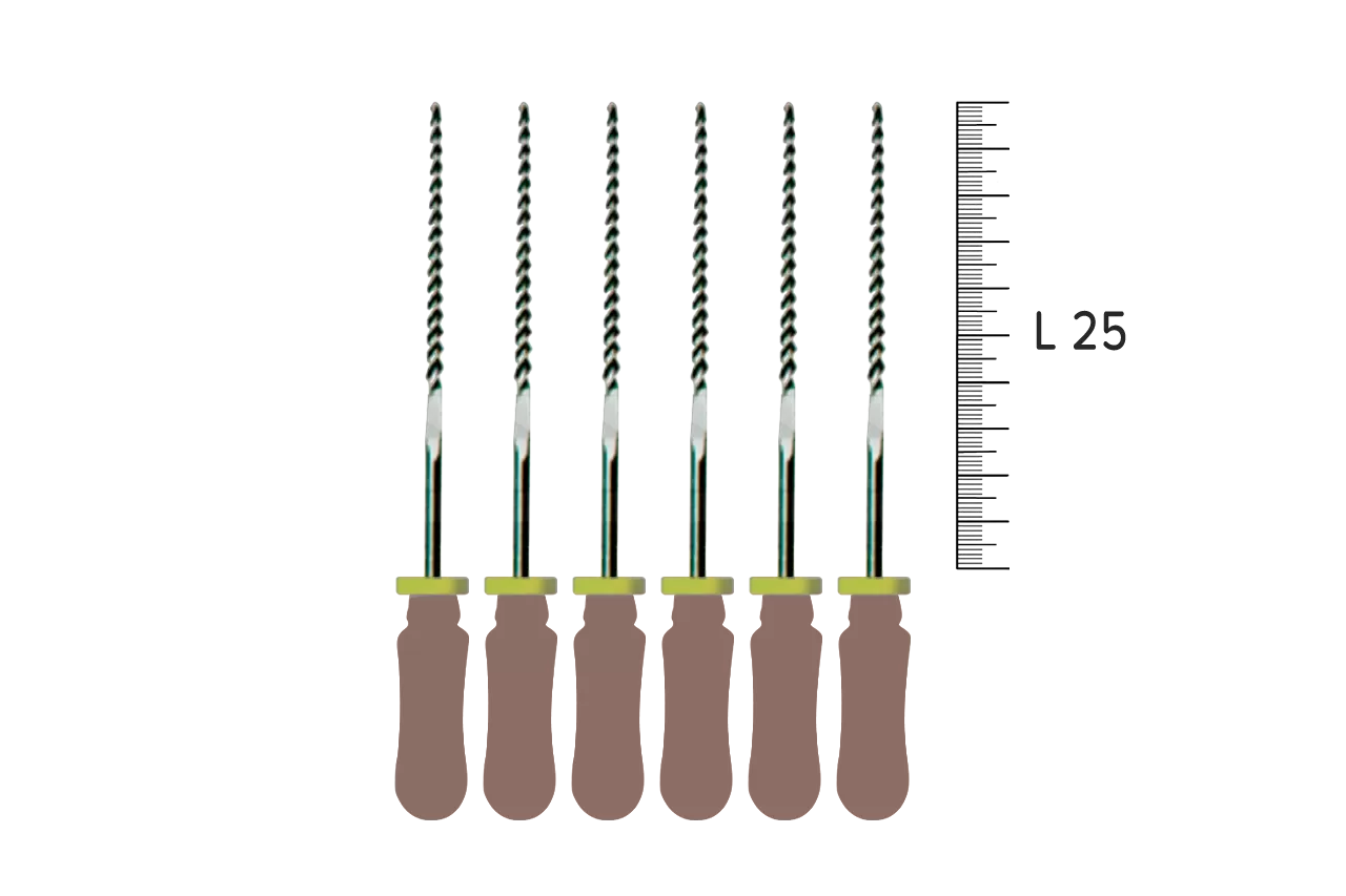 K-Files Mani N6 L25 ручные от Mani используются в стоматологии для подготовки корневых каналов перед проведением сложных реставрационных процедур, включая работу с сильно искривленными каналами. Эти ручные эндодонтические инструменты с режущей функцией имеют спиралевидную нарезку на рабочей части и изготовлены из нержавеющей стали. Рукоятки сделаны из пластика (полибутилентерефталата).