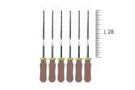 K-File Pro-Endo состоит из нержавеющего хромоникелевого стержня, удобной пластмассовой ручки и силиконового стоппера. Рабочая зона включает спираль с режущими кромками и безопасным кончиком. Количество витков варьируется: 33 витка для маленьких инструментов и 8 для крупных, что обеспечивает отличные режущие характеристики.