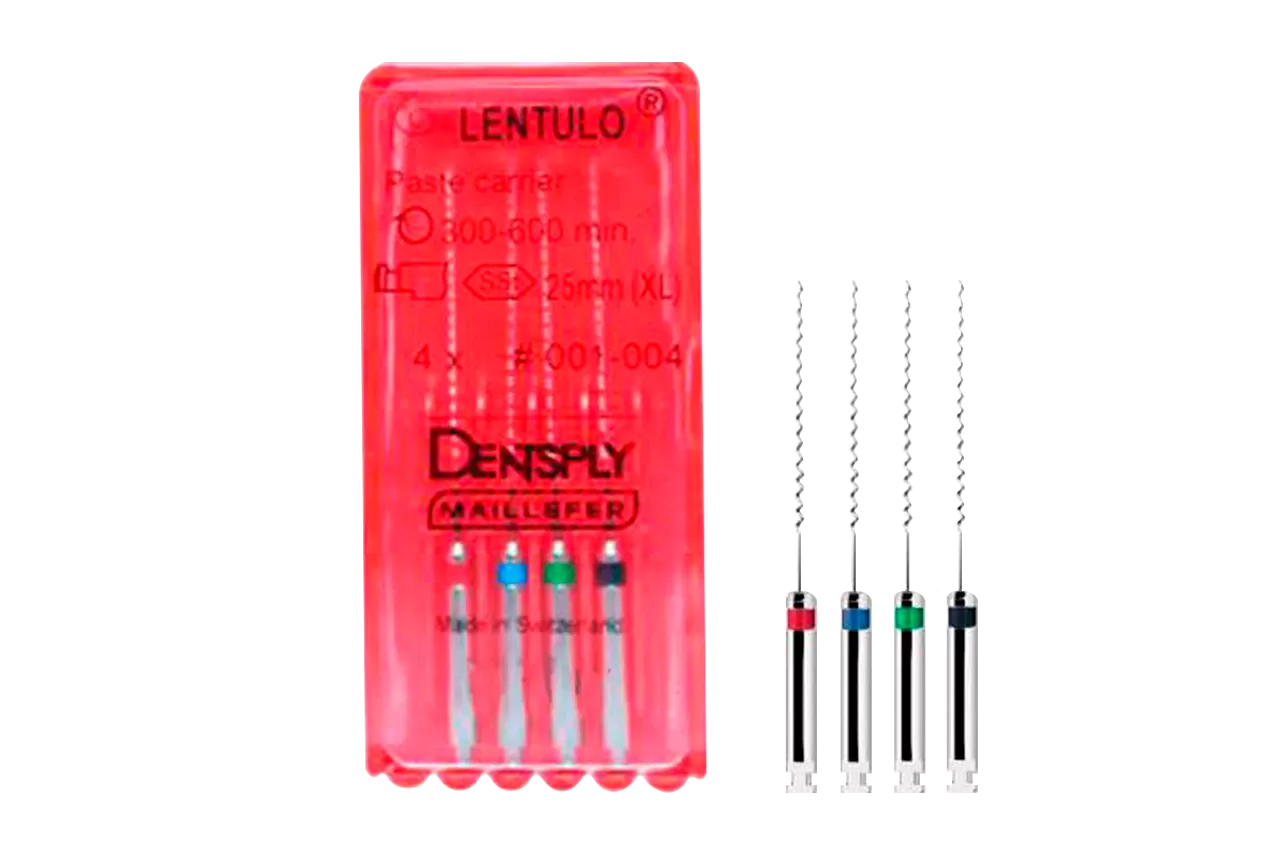 Lentulo N001-004 L21 машинные от Dentsply Sirona - это инструмент с тонкой спиральной формой, предназначенный для заполнения корневых каналов пломбировочной пастой в ходе эндодонтических процедур. Он обеспечивает равномерное распределение материала по всей длине корневого канала.