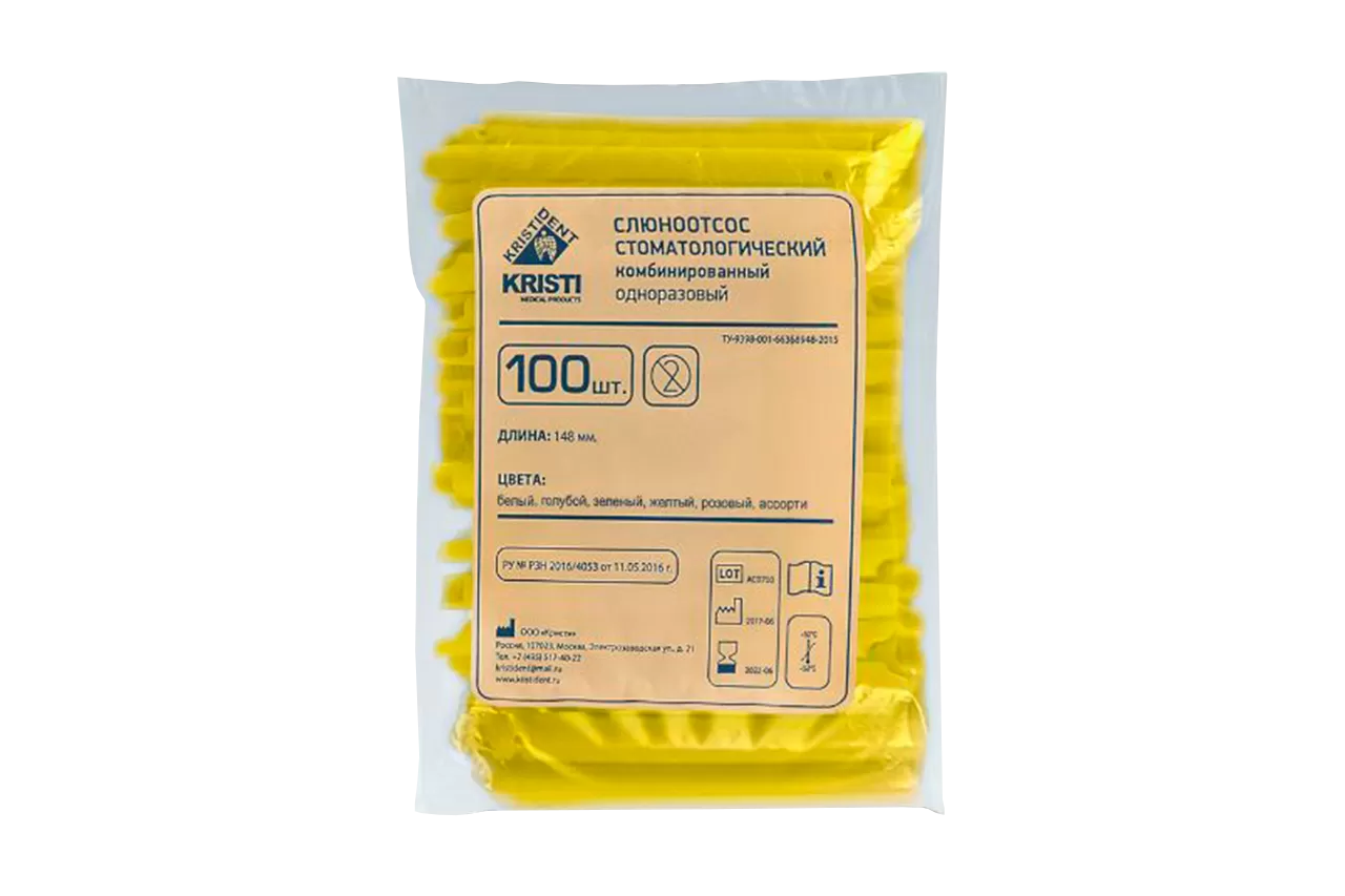Пылесосы одноразовые Кристидент / желтые от производителя Кристидент - аспирационные инструменты для всасывания аэрозолей, твердых частиц и жидкостей из ротовой полости пациента во время стоматологических процедур. Комбинированные наконечники обеспечивают комфорт пациента и безопасность врача благодаря гладким, закругленным краям, которые предотвращают травмирование слизистой оболочки.