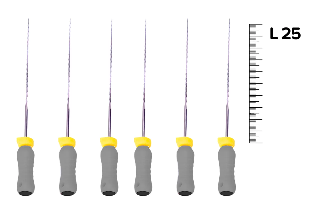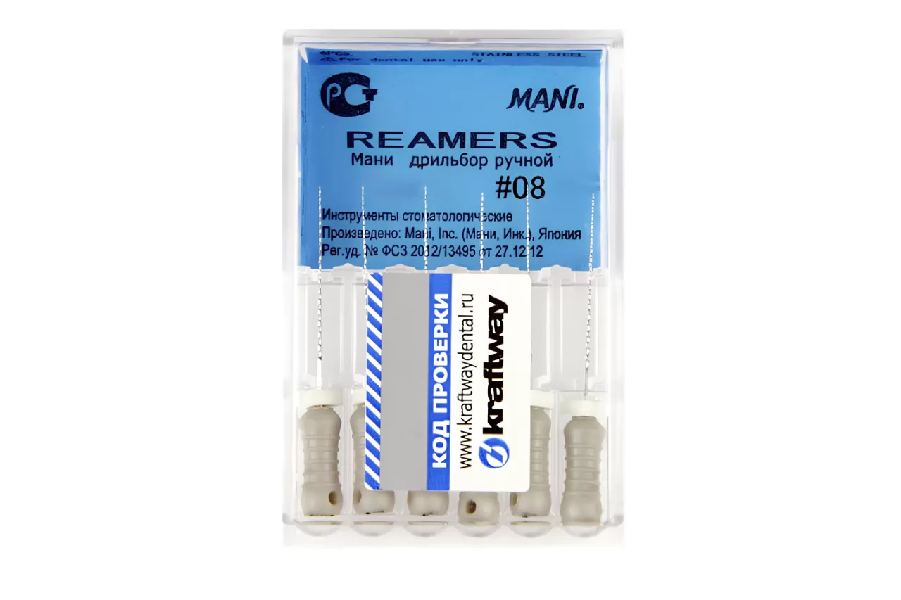 Reamers Mani N08 L25 ручной от японского бренда Mani - ручной стоматологический инструмент, имеющий спиральную нарезку рабочей части. Изготовлен из нержавеющей стали с пластиковой рукояткой. Увеличенный шаг режущих граней способствует повышению режущей способности.