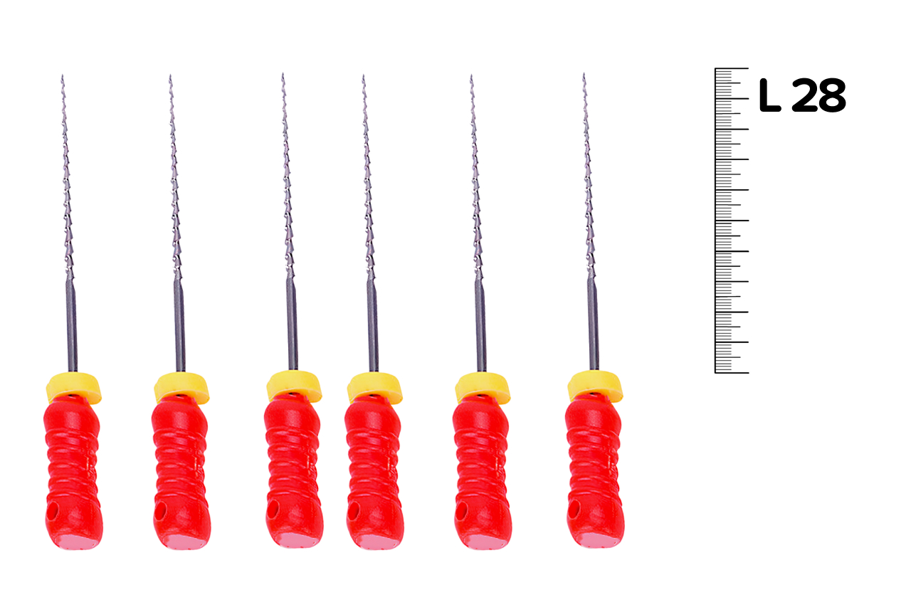 Reamers Mani N25 L28 ручной от японского бренда Mani - ручной стоматологический инструмент, имеющий спиральную нарезку рабочей части. Изготовлен из нержавеющей стали с пластиковой рукояткой. Увеличенный шаг режущих граней способствует повышению режущей способности.