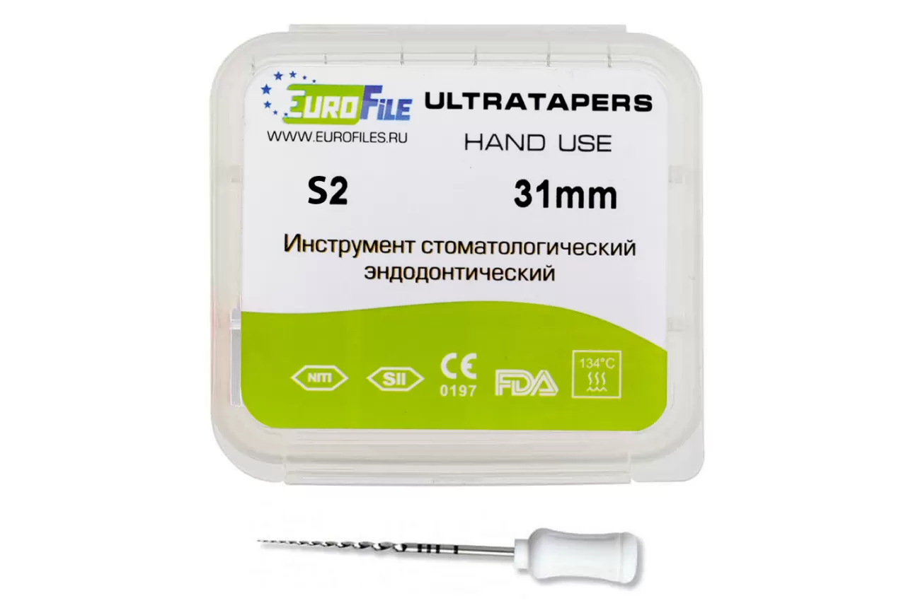 Ручные файлы 31мм S2 от Еврофайл - это высококачественный инструмент, предназначенный для эффективного препарирования корневых каналов. Изготовленные из прочного и гибкого никель-титанового сплава, эти файлы обеспечивают исключальную надежность и долговечность. Треугольное поперечное сечение и постепенно меняющаяся конусность по рабочей длине делают их идеальными для работы с каналами любой сложности. Кончик файлов имеет закругленную форму, что гарантирует безопасность и минимизирует риск повреждения тканей.