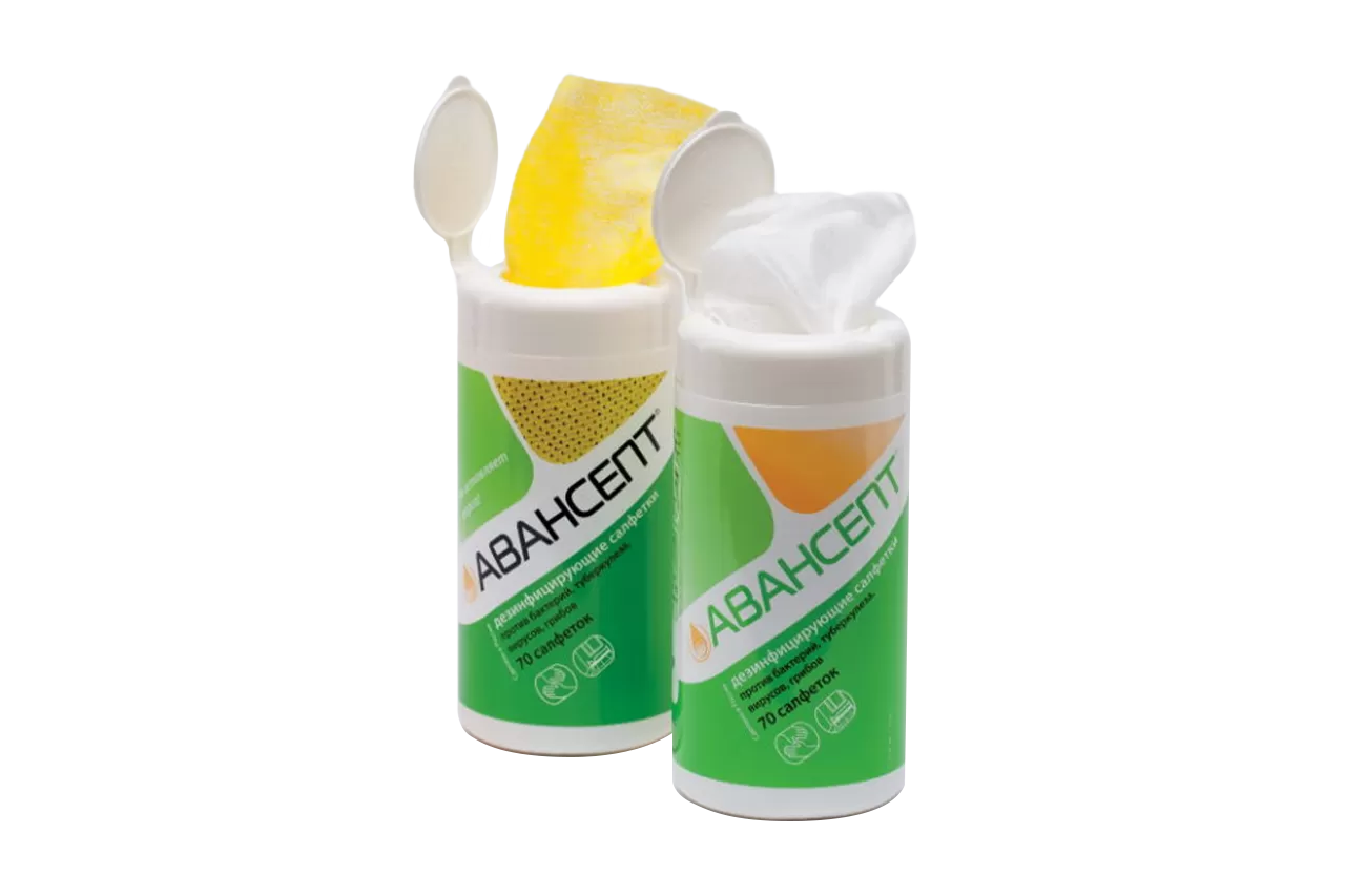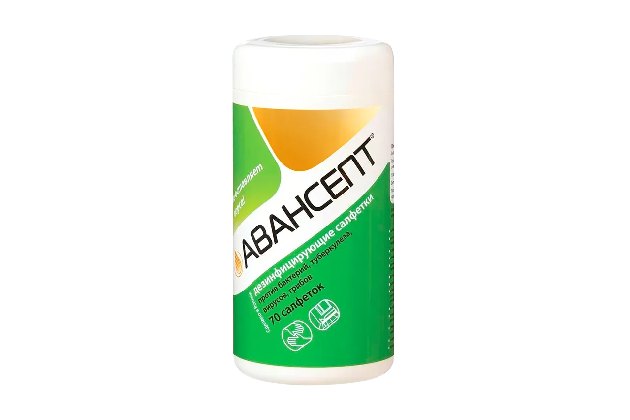 Салфетки дезинфицирующие Авансепт безворсовые, белые от производителя Вита-Пул - безспиртовые антисептические салфетки из нетканого материала для экспресс-дезинфекции небольших поверхностей и гигиенической обработки рук. Активными компонентами являются полигексаметиленгуанидин (ПГМГ) и четвертичные аммониевые соединения (ЧАС). Эффективны против широкого спектра бактерий, вирусов (гепатиты, ОРВИ, ВИЧ) и грибков.