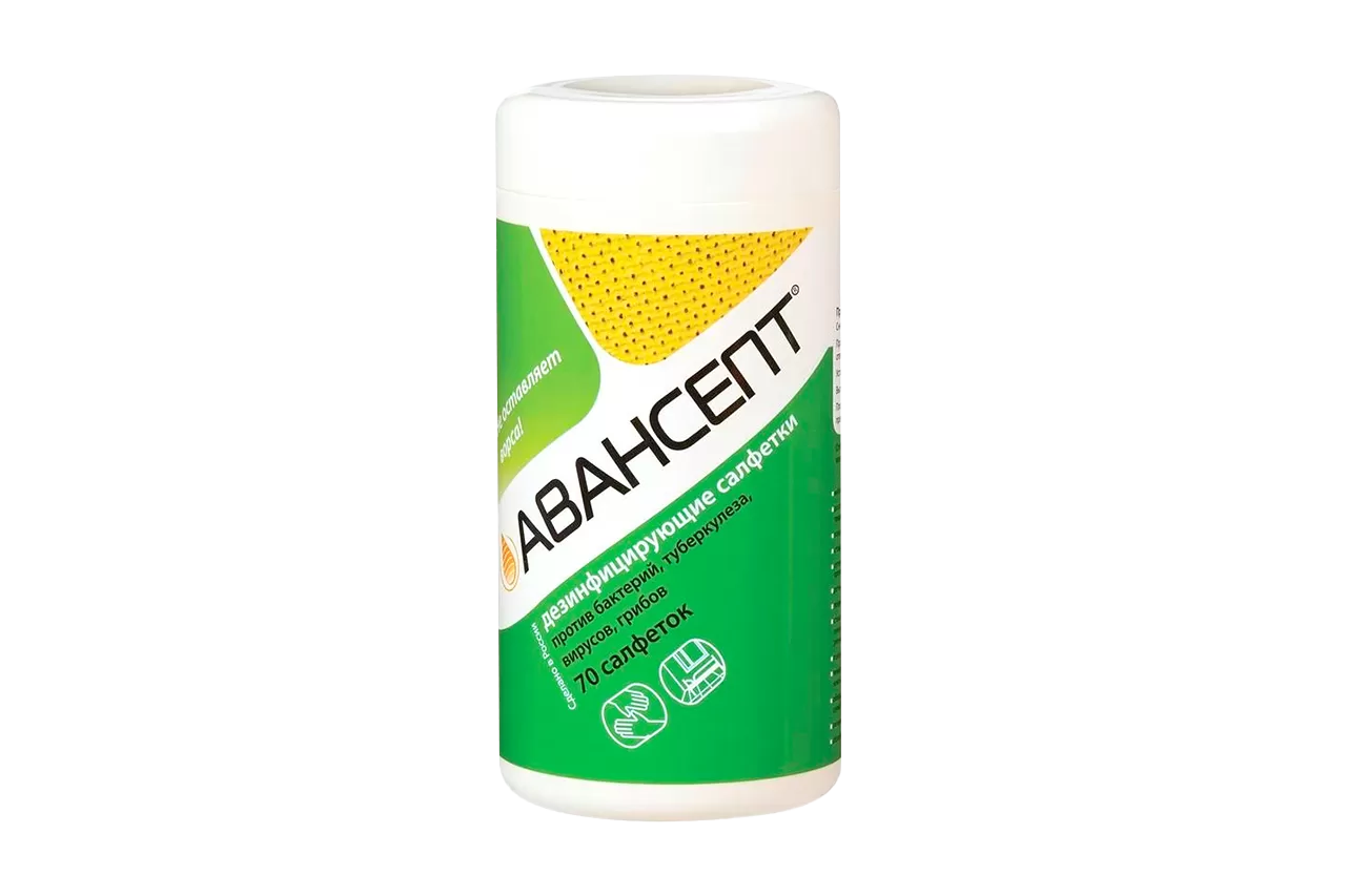 Салфетки дезинфицирующие Авансепт безворсовые, желтые от производителя Вита-Пул - безспиртовые антисептические салфетки из нетканого материала для экспресс-дезинфекции небольших поверхностей и гигиенической обработки рук. Активными компонентами являются полигексаметиленгуанидин (ПГМГ) и четвертичные аммониевые соединения (ЧАС). Эффективны против широкого спектра бактерий, вирусов (гепатиты, ОРВИ, ВИЧ) и грибков.