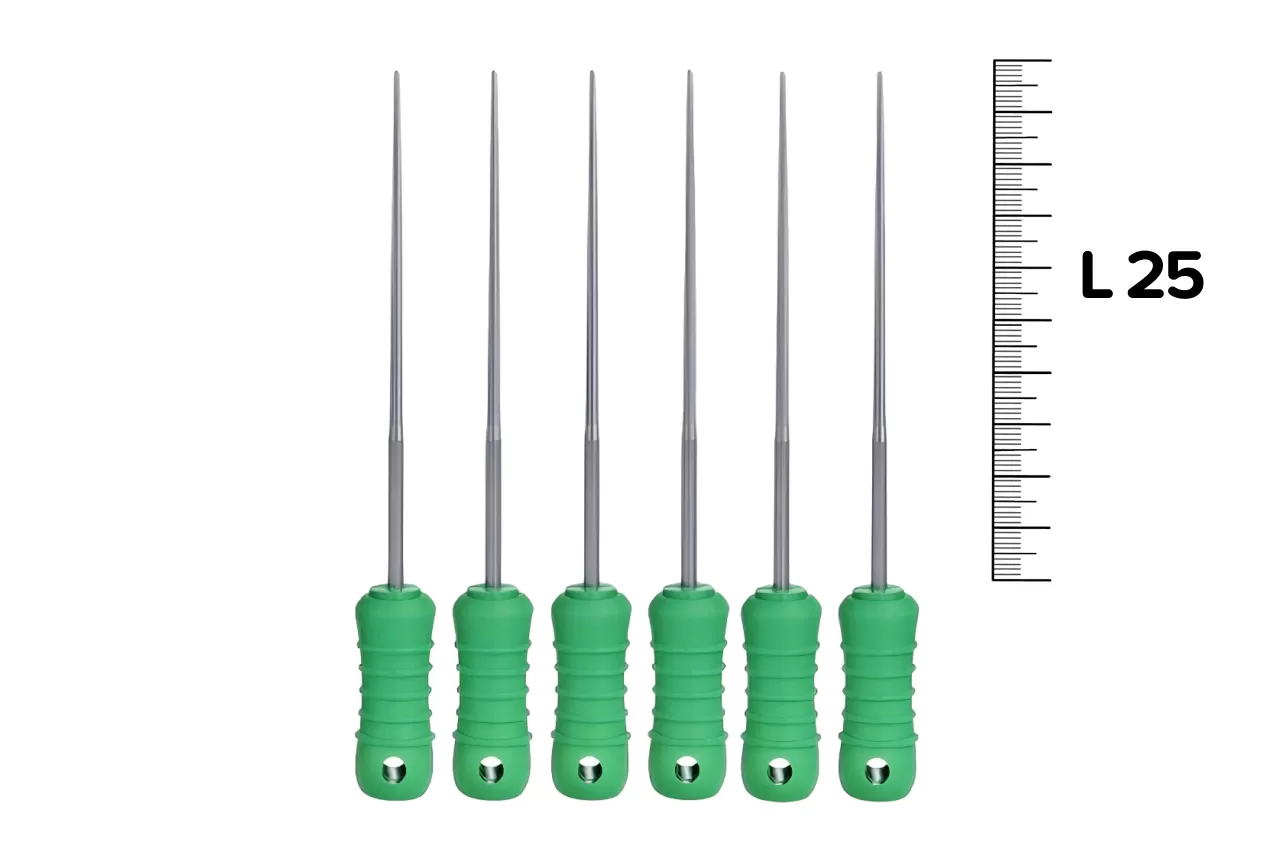 Spreaders Mani N35 L25 сталь ручной от производителя Mani - это ручной стоматологический эндодонтический инструмент, обладающий рабочей частью в форме гладкого усеченного стержня с конусообразным концом. Материалом для рабочей части служит нержавеющая сталь, а для рукоятки используется пластик (полибутилентерефталат). Эти инструменты предназначены для работы с техникой латеральной конденсации, которая включает в себя внесение основного гуттаперчевого штифта, его утрамбовывание в боковом направлении и заполнение канала дополнительными штифтами.