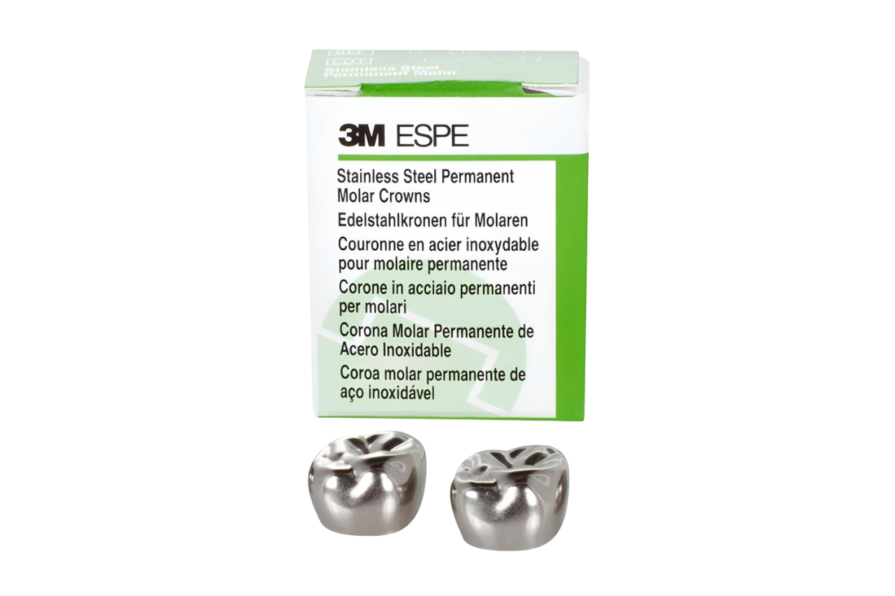 Коронки от американской компании 3M ESPE - преформованные коронки из нержавеющей стали, специально разработанные для временных зубов, которые являются идеальным решением для стоматологов, стремящихся предложить пациентам доступное и надежное восстановление детских зубов. Они точно повторяют естественную форму, высоту и рельеф молочных моляров, обеспечивая комфорт и функциональность, а загнутый край в придесневой области гарантирует отличную фиксацию. Гладкая поверхность из нержавеющей стали не травмирует десны. Коронки используются для защиты от кариеса, исправления дефектов развития, лечения вторичного кариеса, травм, а также после лечения пульпы и в ортодонтии. Противопоказания включают неспособность пациента выдержать лечение, естественное рассасывание временного зуба и рентгенологически подтвержденное рассасывание корня более чем наполовину.