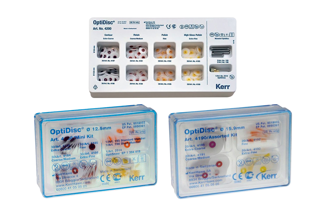 OptiDisc от производителя Kerr - система дисков для контурирования, финишной обработки и полировки реставраций до зеркального блеска. Подходит для композитов, стекло-иономеров, амальгам и драгоценных металлов. Диски обеспечивают точную обработку без царапин и повреждений, благодаря отсутствию выступающего держателя. Они имеют цветовую кодировку для удобства выбора степени абразивности и обеспечивают долговечность благодаря полиэстеровому слою. Укороченный дискодержатель и прозрачность дисков облегчают работу с труднодоступными участками.