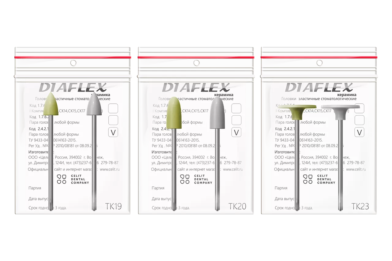 Эластичные стоматологические головки Diaflex.Керамика от российского производителя Целит - качественные инструменты из натурального каучука с добавлением синтетических алмазов. Головки бывают двух типов: жёлто-зелёные с крупной фракцией алмазов для предварительной обработки и светло-серые с мелкой фракцией для окончательной полировки. Перед использованием полиры требуют стерилизации, а в процессе работы рекомендуется орошение водой. Эти головки обеспечивают эффективную обработку ортопедических конструкций из стоматологической керамики и совместимы с различными стоматологическими наконечниками.