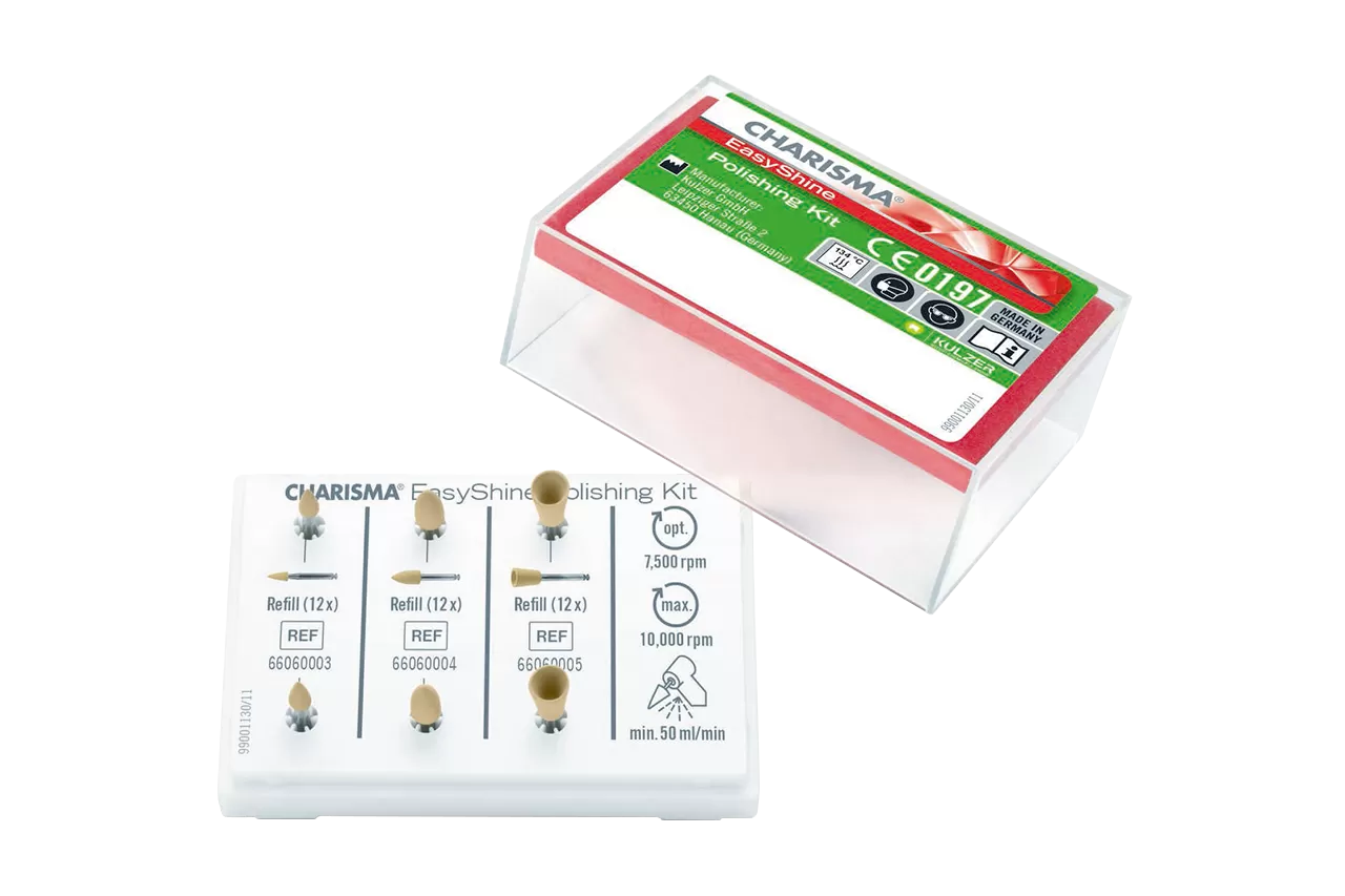 Charisma EasyShine от производителя Heraeus Kulzer - идеальное решение для завершения композитных реставраций с великолепными показателями полировки. Одноступенчатая система упрощает рабочий процесс, устраняя необходимость смены инструментов; сглаживание и полировка с высоким блеском выполняются в один шаг путем изменения приложенного давления. Усиленная алмазной крошкой формула обеспечивает отличные результаты, три доступные формы (Пламя, Большое пламя и Чашка) охватывают широкий спектр показаний к применению, а совместимость с композитами Kulzer делает полиры универсальными и экономичными. Многоразовые головки пригодны для стерилизации, что повышает долговечность инструмента и снижает риск вторичного кариеса.