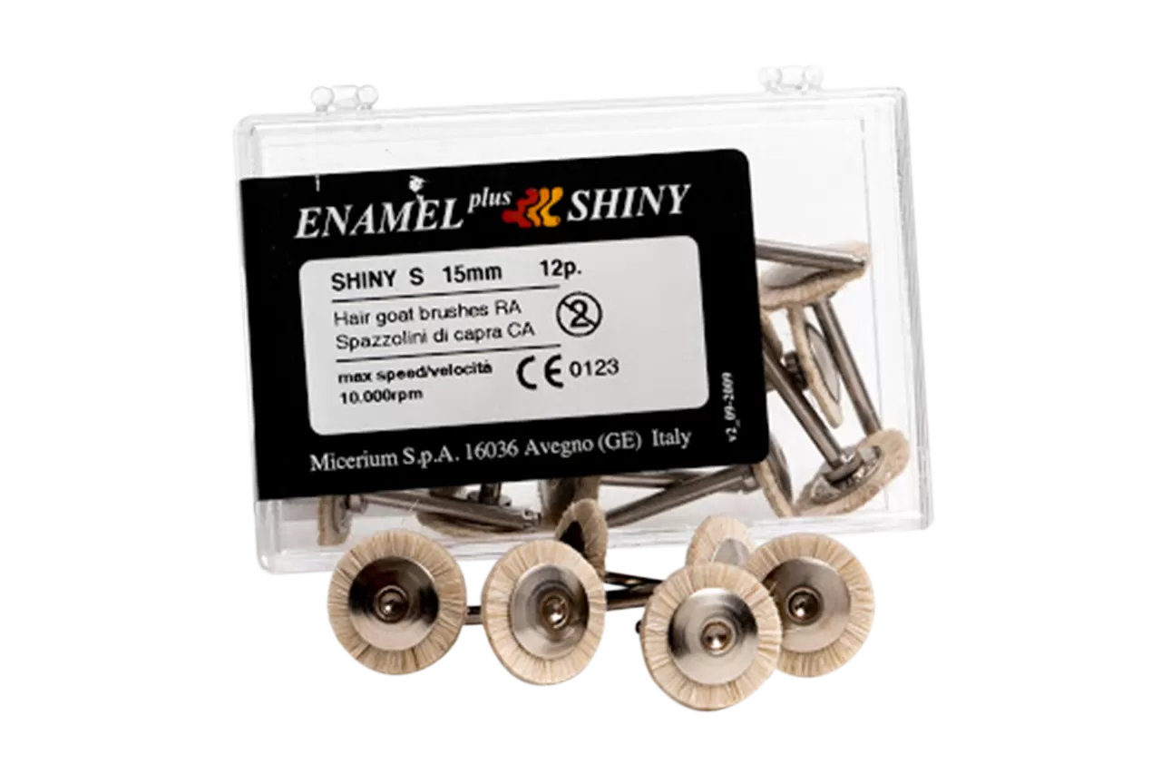Щетки Shiny S от компании Micerium S.p.A. предназначены для полировки композитов и являются частью системы Enamel Plus Shiny. Изготовленные из козьей щетины, они обеспечивают высококачественную шлифовку и полировку, создавая реставрации, идентичные естественным зубам. Щетки имеют диаметр 15 мм и оснащены угловым наконечником (RA), что делает их удобными для использования в клинических условиях.