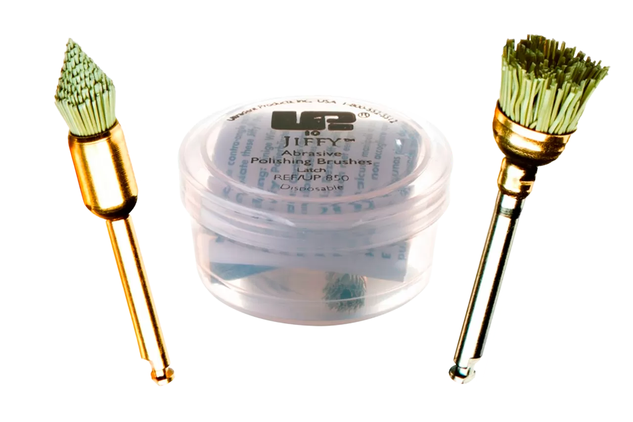 Jiffy Pointed Brushes от производителя Ultradent - полировальные щетки конусной формы, которые не требуют использования полировальной пасты. Изготовленные из синтетического волокна с абразивными частицами карбида кремния, они обеспечивают качественную полировку, легко адаптируясь к сложным рельефам обрабатываемых поверхностей. Эти щетки упрощают процесс полировки композитных материалов, устраняя необходимость в дополнительных полировочных средствах.