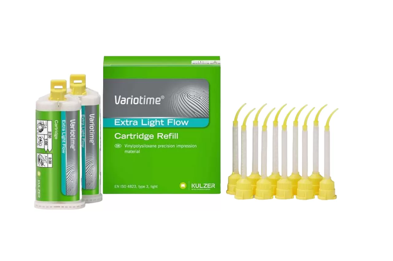 Variotime Extra Light Flow корригирующий слой - A-Силиконовый материал для снятия оттисков тип 3 (очень низкой вязкости, жидкотекучий), для коррекции оттисков, в картриджах по 50 мл, от Kulzer. Материал обладает высокой гидрофильностью, пластичностью и прочностью, что позволяет использовать его для проведения «extra light» оттисков даже самых сложных элементов. Из-за своей низкой вязкости, рекомендуется для двухэтапных методик.